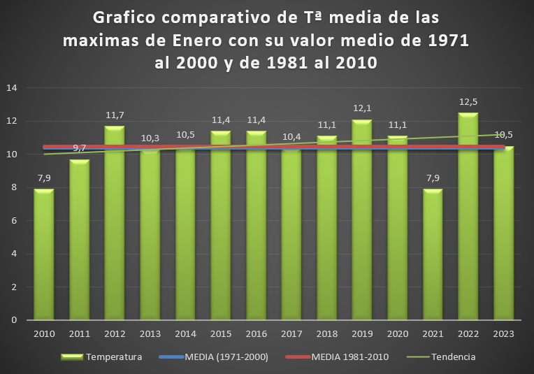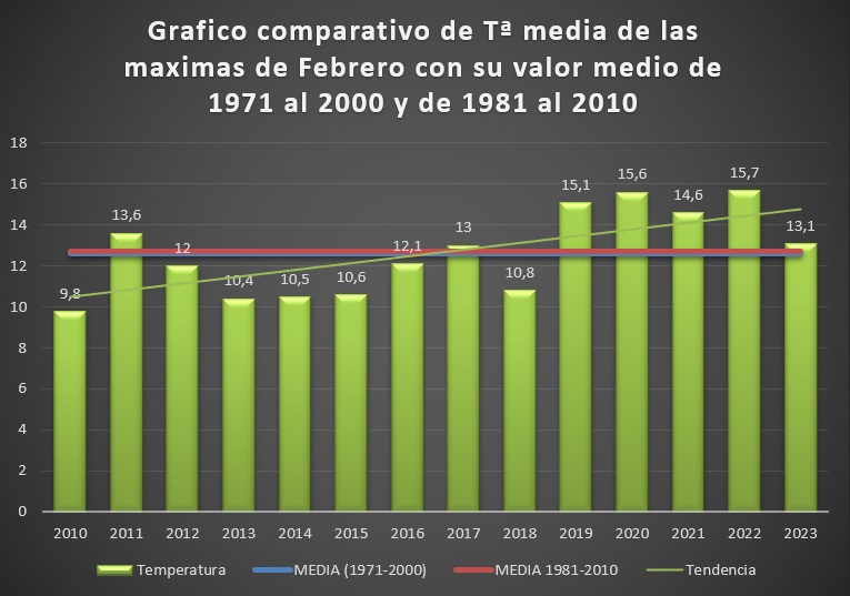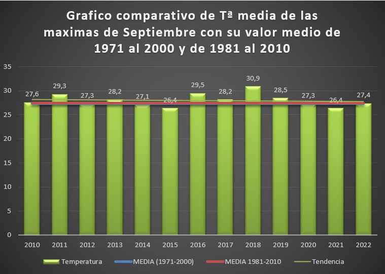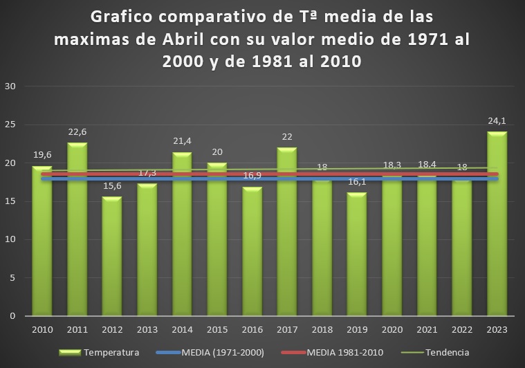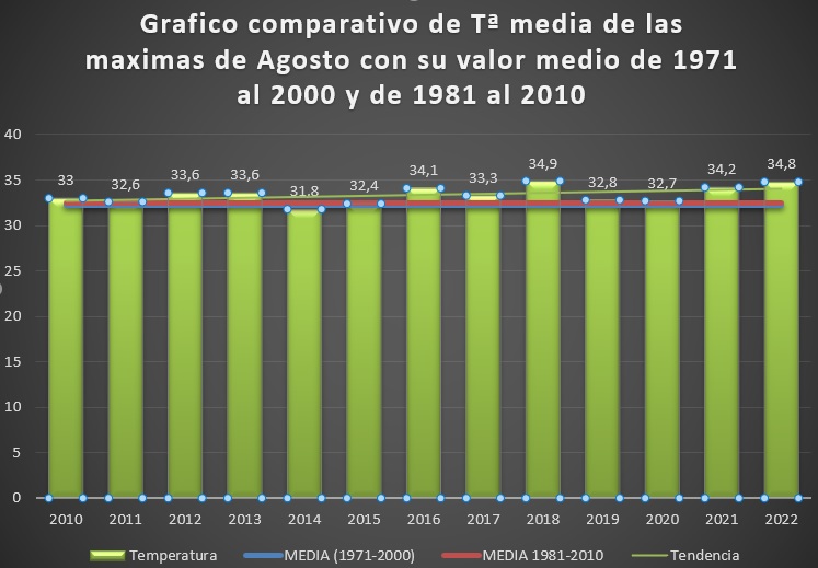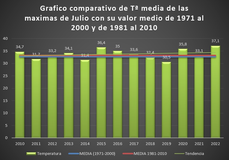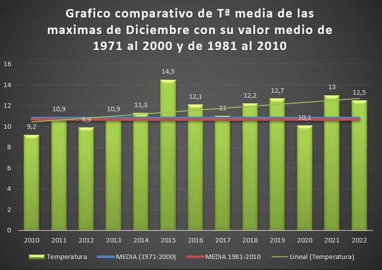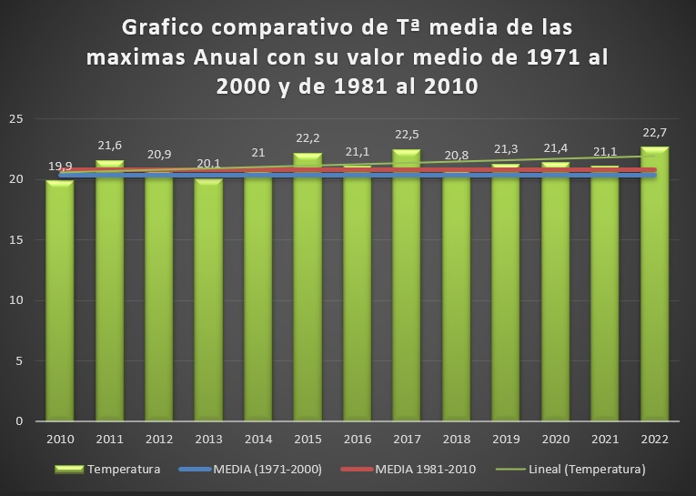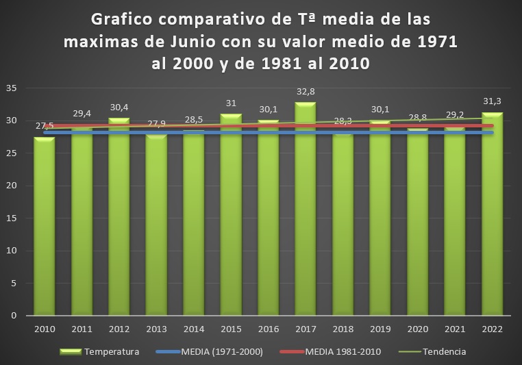 Grafico Comparativo de Temperatura Media de las Máximas con su valor medio de 1971 al 2000 y de 1981 al 2010