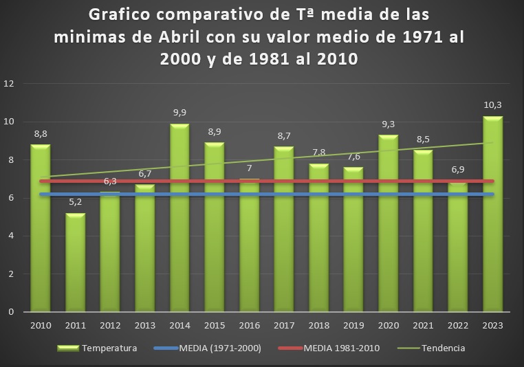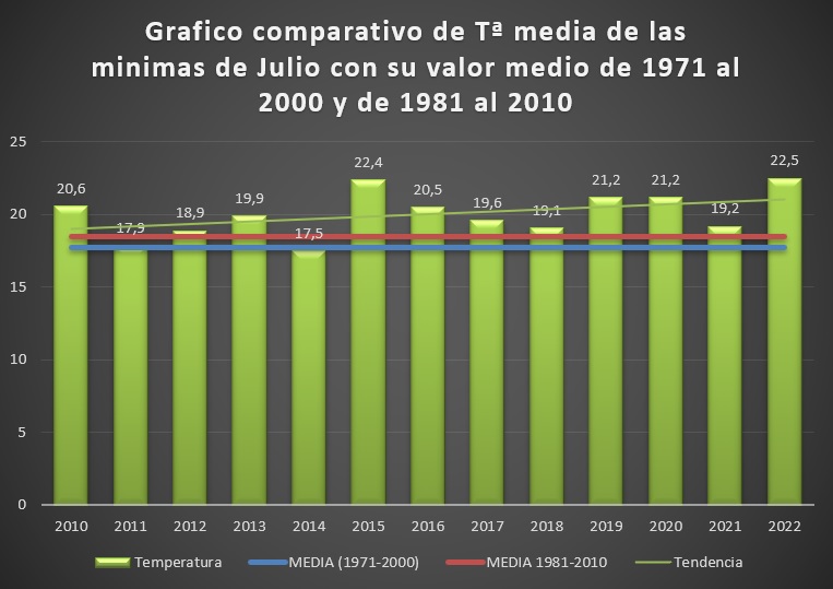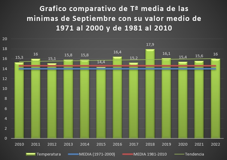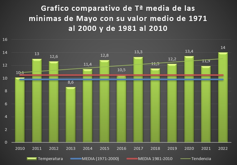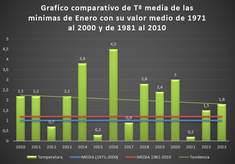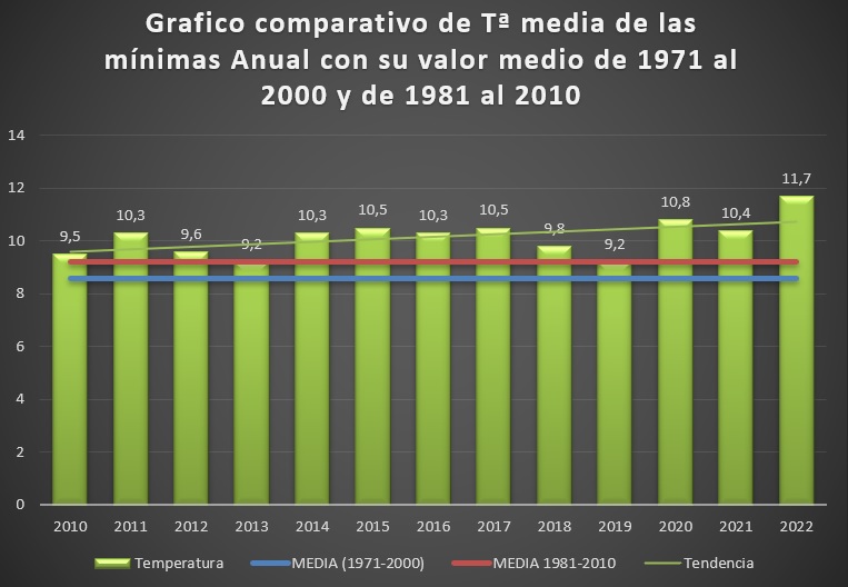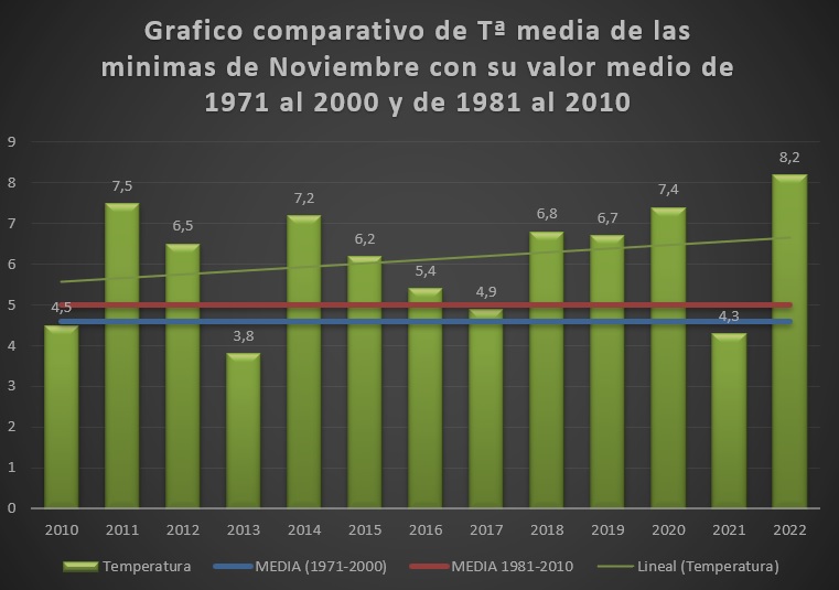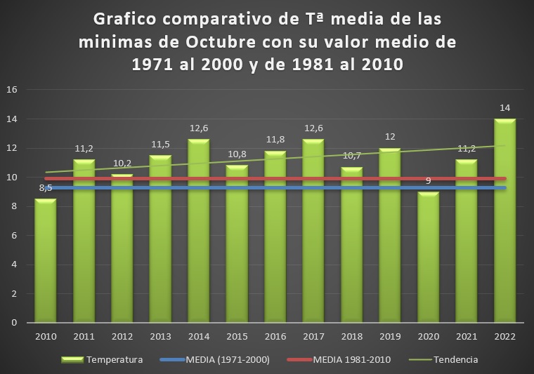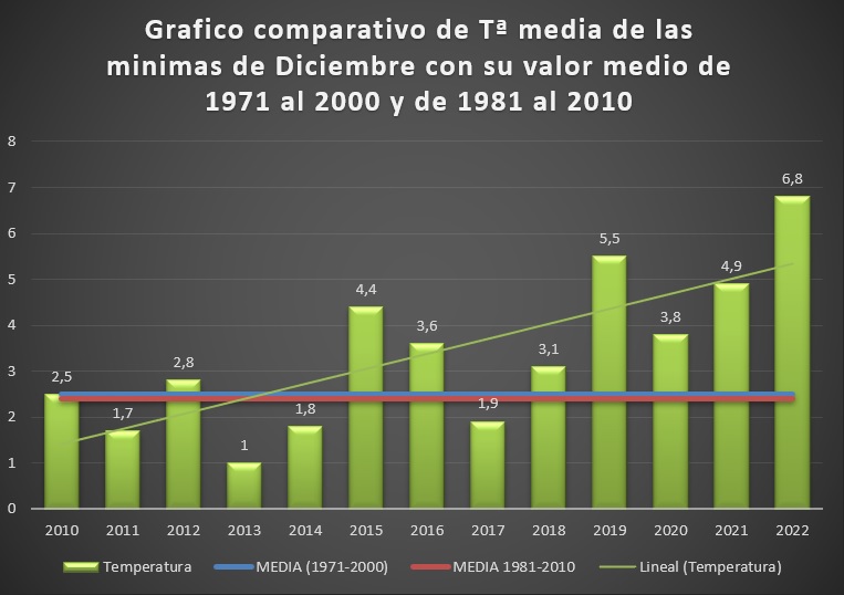 Grafico Comparativo de Temperatura Media de las Mínimas con su valor medio de 1971 al 2000 y de 1981 al 2010